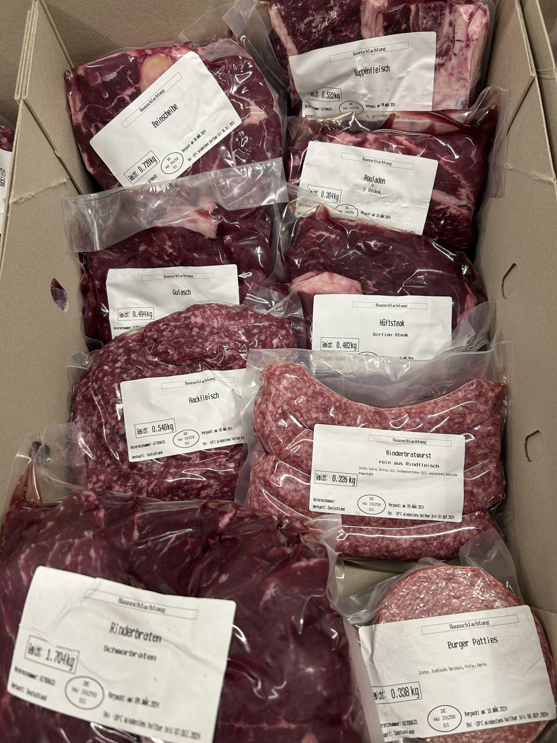 Möchten Sie sich ein halbes Rind (ca. 150 Kg) mit Freunden, Bekannten oder der Familie teilen? Kein Problem, nehmen Sie dazu einfach Kontakt mit uns auf und wir erstellen Ihnen ein individuelles Angebot.